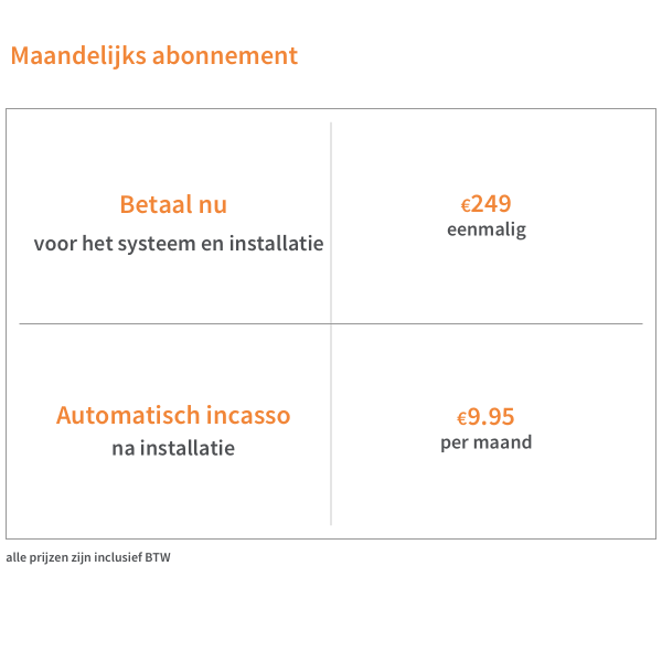 Middels de aankoop van dit product neemt u tevens een maandabonnement à € 9,95 per maand. Het automatisch incasso voor de abonnementskosten start na de installatie van het systeem en nadat u toegang heeft gekregen tot uw persoonlijke account.